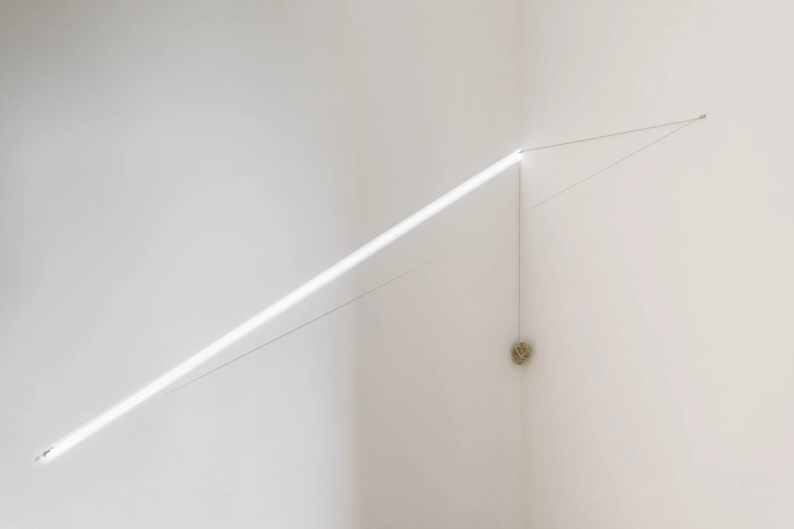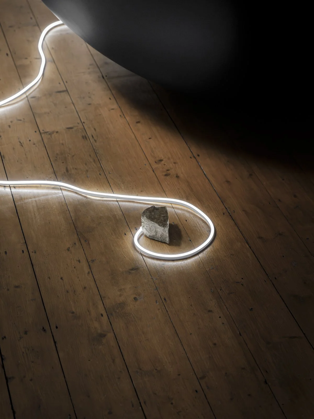 Air-filled sphere, LED tube, natural rock.
